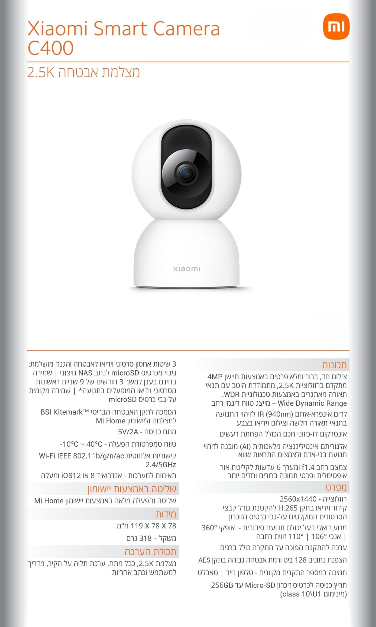 עמוד הבית צילום מצלמות אבטחה Xiaomi Smart Security Camera C400 2.5K מצלמת אבטחה יבואן רשמי