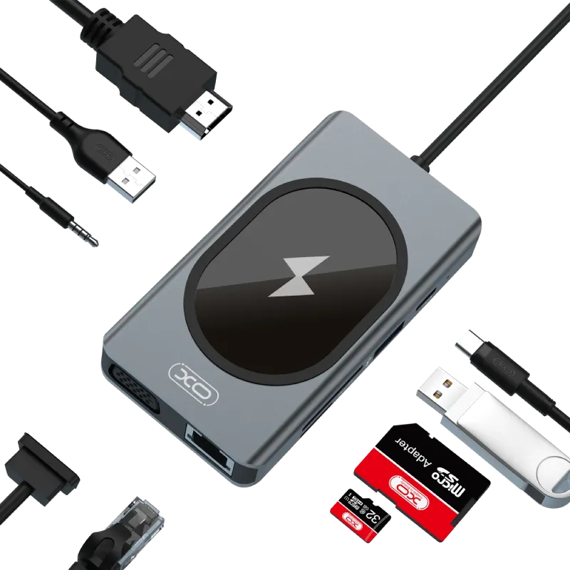 עמוד הבית מחשוב מתאמים ותחנות עגינה XO-HUB007 מתאם 9IN1 Type-C To RJ45/HDMI/VGA/USB/PD/AUX/SD